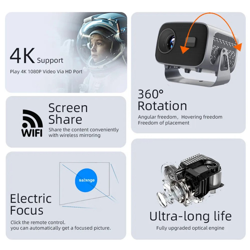 ویدئو پروژکتور مدل HY310 یک ویدئو پروژکتور کوچک با کیفیت بالا، وزن سبک و قابل حمل آسان برای استفاده در مکان مختلف مناسب است. این ویدئو پروژکتور میتواند تصاویر را با 4K HD نمایش دهد. 4000 لومن ANSI (تبلیغ شده به عنوان 6000 لومن) بر روی صفحه نمایش تا 200 اینچ، حتی در محیط های با نور متوسط، پخش می شود.تصاویر پخش شده توسط دستگاه کاملا واضح بوده و رنگ ها به صورت طبیعی و درخشان دیده می شوند. این پروژکتور دارای سیستم عامل Android 11.0 است و بدون نیاز به سیستم لپ تاپ و یا کامپیوتر میتواند مستقیما به اینترنت وصل شود تا بتوانید به راحتی بیش از 4000 برنامه یا محتوای مورد نظر خود را دانلود کنید.با وضوح تصویر بالا به شما تصاویر واضح ارائه میکند. با طراحی زیبا و مدرن خود به شما تجربه سینمایی فوق العاده در خانه می دهد، فیلم تماشا کنید و از مهمانی ها لذت ببرید. حافظه رم 8 گیگابایت و رام 1 گیگابایت میباشد Wi-Fi داخلی و بلوتوث برای پخش بیوقفه محتوا، بهصورت بیسیم به دستگاههای خود متصل شوید. میتوانید گوشی های اندرویدی و آیفون خود را به طور مستقیم و بدون سیم به آن متصل کنید و تصویر دیوایس خود را روی پرده یا دیوار نمایش دهید (این قابلیت برای ویندوز نیز موجود هست فوکوس خودکار و تصحیح کیستون باعث شده که با تنظیم بدون دردسر و با فوکوس خودکار و تنظیم تصویر از ان لذت ببرید. با وزن تنها 1.26 کیلوگرم، HY310 به راحتی در یک کوله پشتی قرار می گیرد تا قابلیت حمل نهایی را داشته باشد. تا 50000 ساعت عمر لامپ سالها لذت را تضمین می کند. دارای بلندگوهای دوگانه استریو که باعث میشه با بلندگوهای داخلی در صدای غنی غوطه ور شوید.